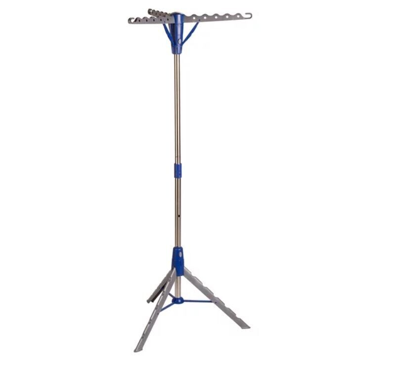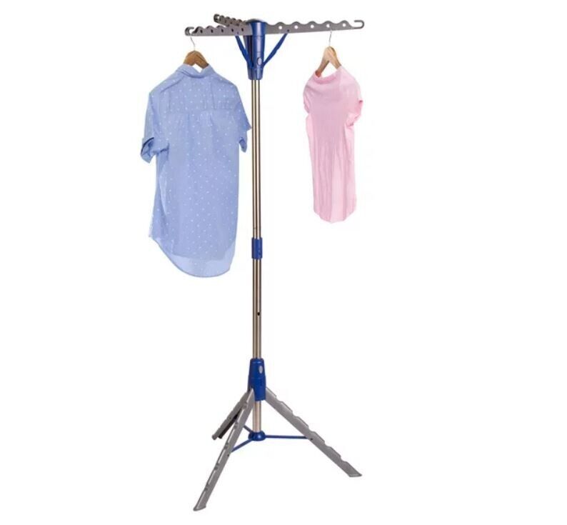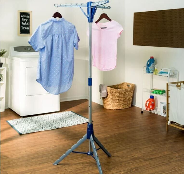 WE DON'T SHIP TO PO Box ADDRESSES Drying Rack Clothes Hanger Tripod Dry Laundry Folding Expandable Indoor Dryer Free Shipping – Free Returns – Money Back Guarantee Description As our mother always said: CLEAN CLOTHES SHOULD NEVER TOUCH THE FLOOR. At 64 inches tall, this drying rack ensures we’ll never disappoint her. Your longest dresses and scarves can hang here to dry without grazing the laundry room floor and undoing all that work you just did washing them. Each rod can hold 10 hangers for delicates and other line-dry items. With a touch of a button, it expands from its storage size, and you can call on it not only to hold wet clothing, but if you need extra hanging space for coats or hats. Collapses compactly for storage Simply push a button to expand Holds up to 30 garments 64-inch height keeps clothes off the floor and fluttering in the breeze