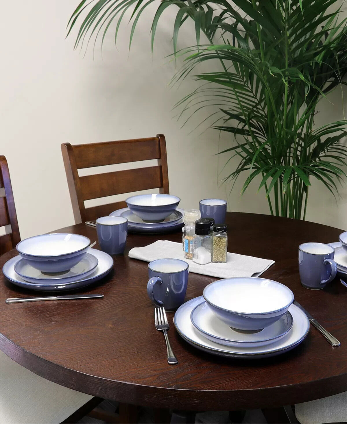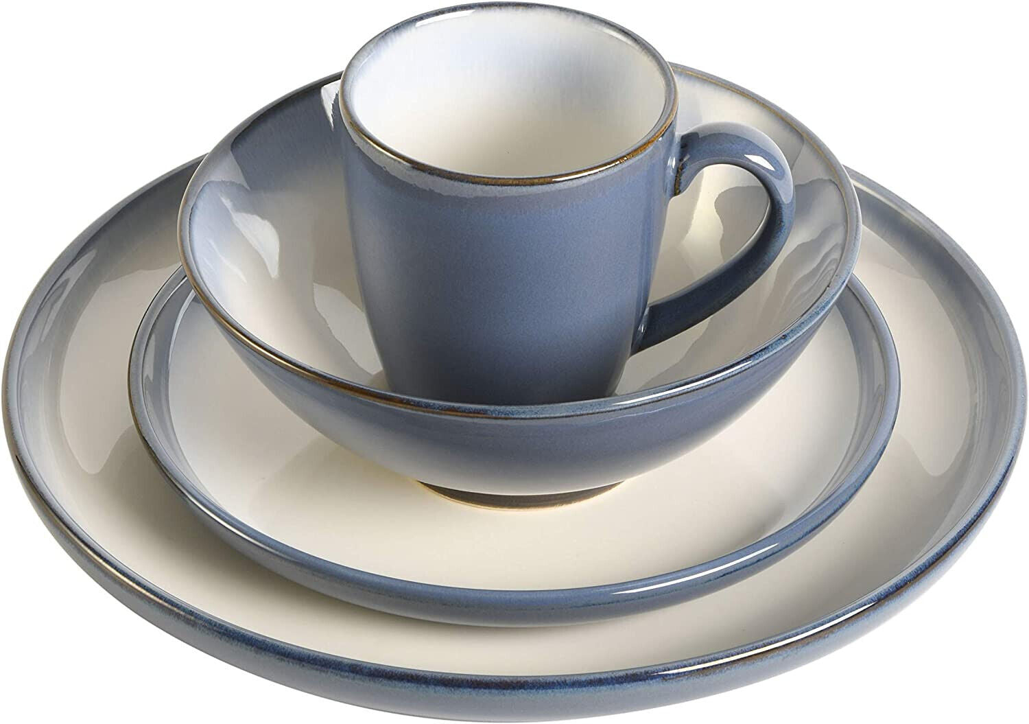 delicate dinnerware, making it ideal for big or small occasions. Service for four includes: Four 11.5 in. Dinner Plates Four 8.5 in. Dessert Plates Four 7.5 in. Bowls Four 13 oz. Mugs CARE INSTRUCTIONS: beautiful dishes that are also dishwasher and microwave safe STONEWARE/REACTIVE GLAZE: reactive refers to a technique how multiple