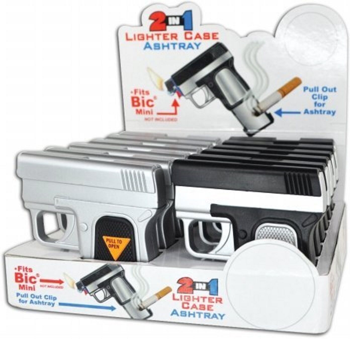 Pistol Shaped Multi-Use Lighter Case w/Ashtray 2 in 1 Lighter Case Ashtray Cigarette Case Pistol Shaped Mini Bic Holder Ash Tray in Handle Ash Tray Can Be Used as a Secret Compartment 1 x Color - Silver/Black Fits Bic Mini (lighter is not included)