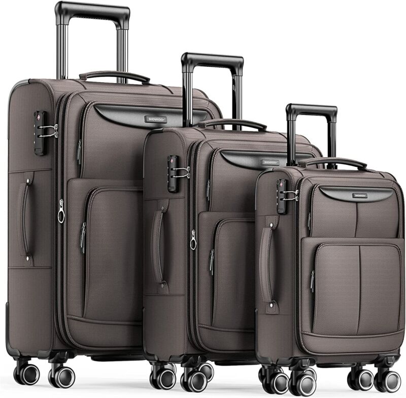 Luggage Sets 3 Piece Softside Expandable Lightweight Durable Suitcase Sets Double Spinner Wheels TSA Lock Light Coffee (20in/24in/28in) -------------------------------------------------------- Product Description : Top Softside Luggage Sets: Made of high-density oxford fabric, resists stains and waterproof, high abrasion resistance to keep the softside softshell luggage beautiful. 20 inch is the most suitable to carry around, 24in & 28in can expand 20% of the increase space. Capacity: 20in43L 24in63L 28in 85L. Ergonomic 3-Step Durable Iron Handle: The button-type multi-level handle can be adjusted to different heights, while minimizing the effect of the swing and self-aligning magnetic wheel, and can roll the top straight in any direction. The handle will lock when fully extended so that you can push or pull the suitcase. When fully recessed, the handle will also be locked, which greatly reduces the risk of damage when not in use and is easy to operate. 360° Silent Double-Row Spinner Wheels: With four 360-degree rotating wheels, the Softside Luggage Sets can rotate silently and smoothly, making it easy to move. All parts roll upright, so there is no weight on the arms and travel is easy. Secure Combination TSA Lock: The TSA lock installed on the side only allows the TSA agent to check your luggage without damaging the lock while traveling. The zipper is not easy to be pierced by sharp tools (such as pens) to better protect the softside luggage and privacy. Large Capacity and Convenient Design: Padded handles on the top and sides provide comfort when lifting a full-packed suitcase, making luggage easy to carry. There are two large external pockets for storing the last items. Full zipper internal dividers and cross straps increase the organization of the packaging. The cross strap protects the baggage in the luggage to prevent movement that may cause damage, and also helps to keep baggage organized.