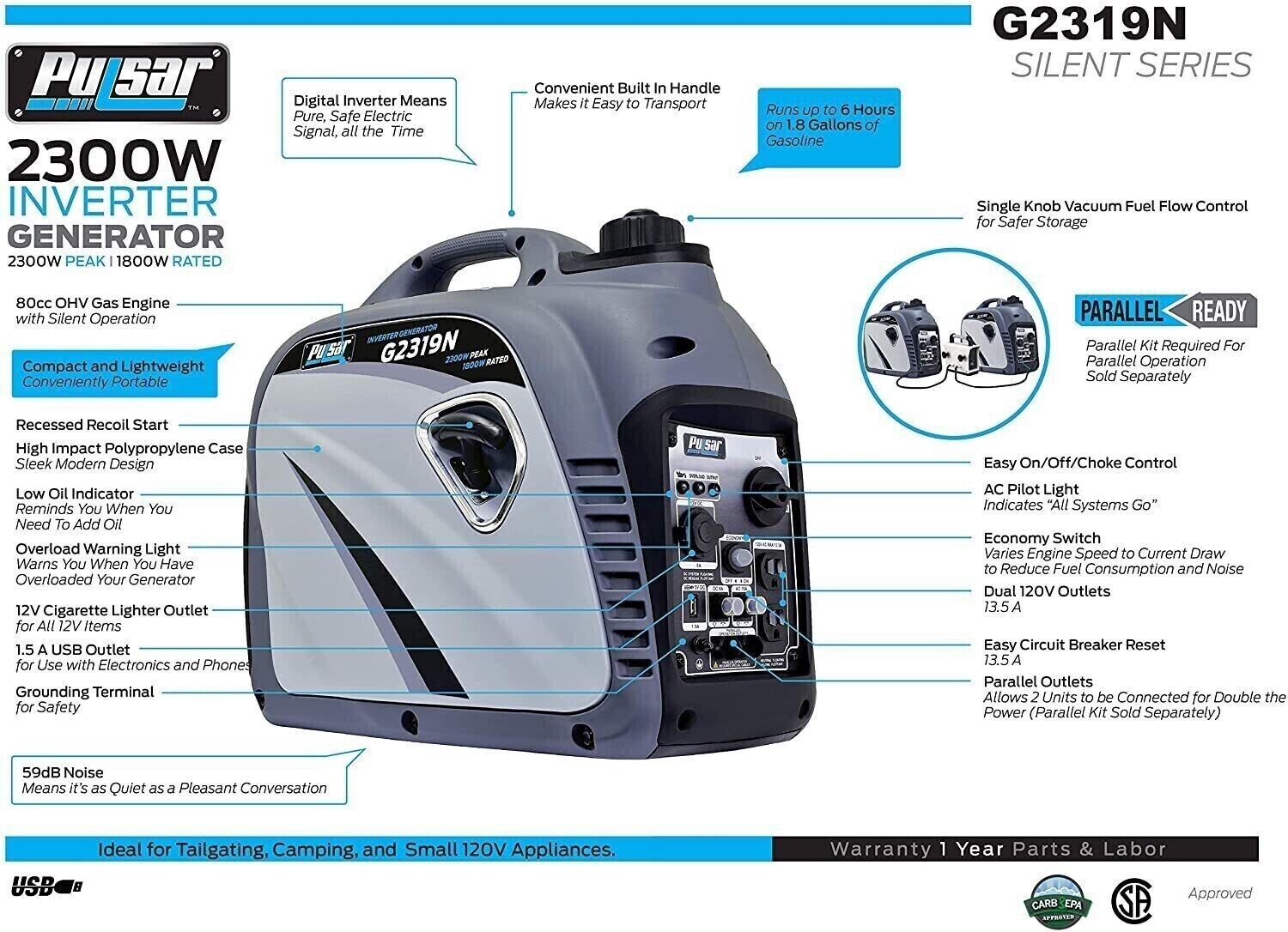 Pulsar 2300 Watt Portable Gasoline Inverter Generator Quiet Operation G2319N, Authorized Dealer, Fast Free ShippingBrand: PulsarWattage: 2300 wattsFuel Type: GasolinePower Source: gas-poweredItem Weight: 47 PoundsVoltage: 120 VoltsColor: 2300w Inverter Generator...